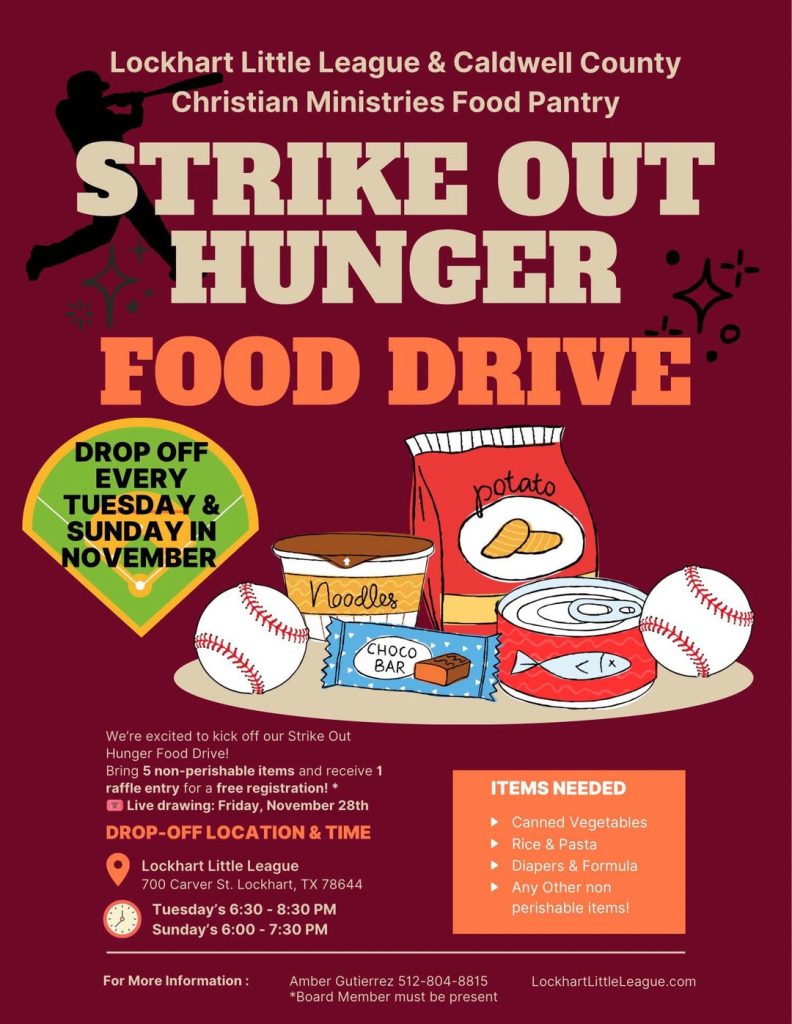 With the same thought in mind to help the community, the Lockhart Little League and Caldwell County Christian Ministires Food Pantry are hositng a “Strike Out Hunger” food drive through November. The event requests the same non-perishable items as listed above but also remembering the need for baby formula and food and diapers. They are also hosting a raffle for those who donate. If you bring in 5 items you will receive one raffle entry for a free registration. The drawing will be held on November 28th. Drop off location for this food drive is Lockhart Little League Diamond at 700 Carver St. in Lockhart. Donations will be accepted on Tuesdays from 6:30-8:30 pm and Sunday’s from 6-7:30 pm. For more information contact Amber Gutierrez at 512-804-8815.