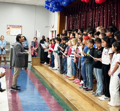 Top, Music teacher Santiago Ochoa leading the fourth grade choir as they sing patriotic songs. Photos submitted by ... -