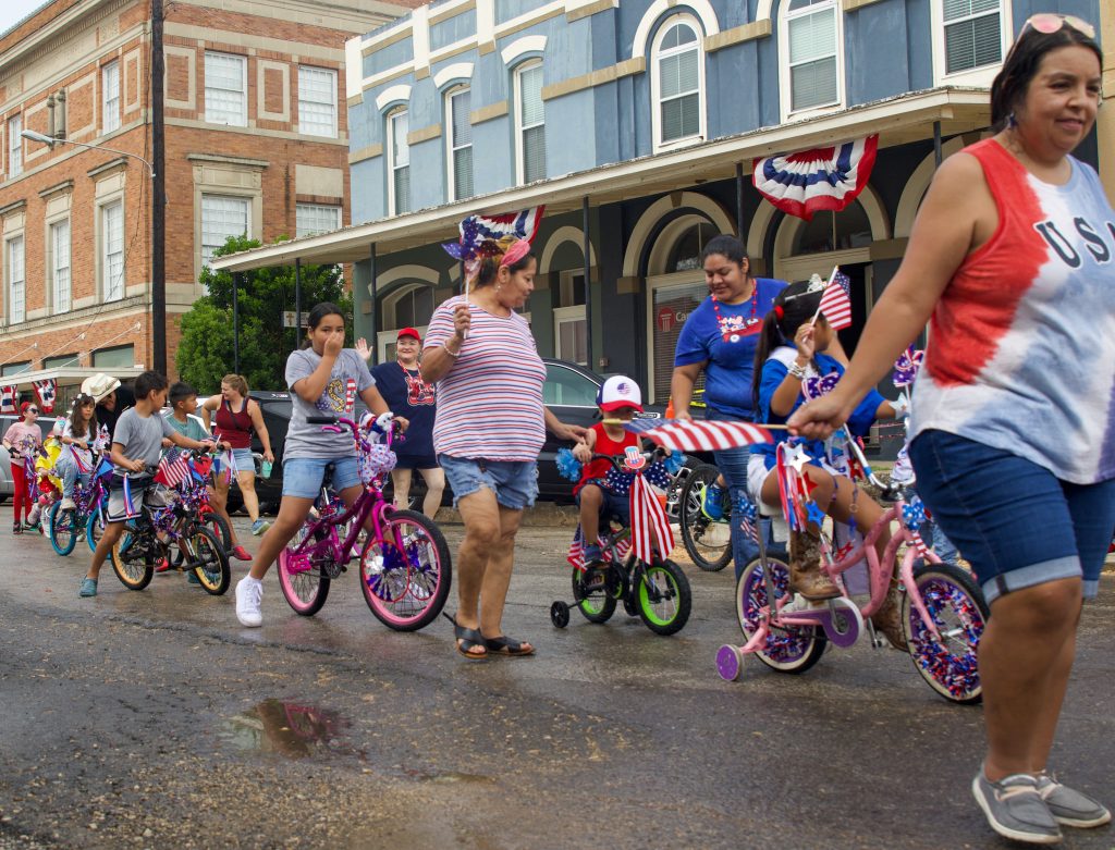 Above, On July 3rd, a large crowd gathered and braved the rainy weather to take part in the Dr. Eugene Clark Library’s Red, White, and Blue Lockhart Bike Parade and also celebrated the Library’s 125th birthday.