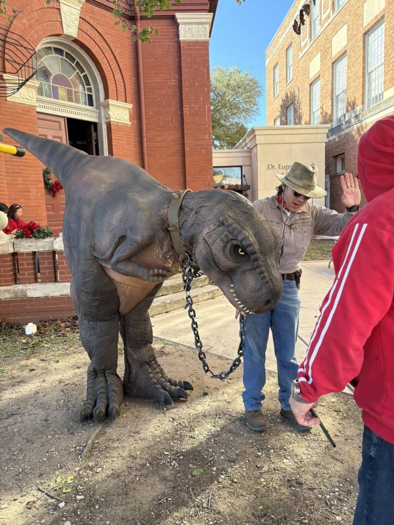 visitor from the wild. A dinosaur made an appearance for guests. Photo courtesy of Dr. Eugene Clark Library.