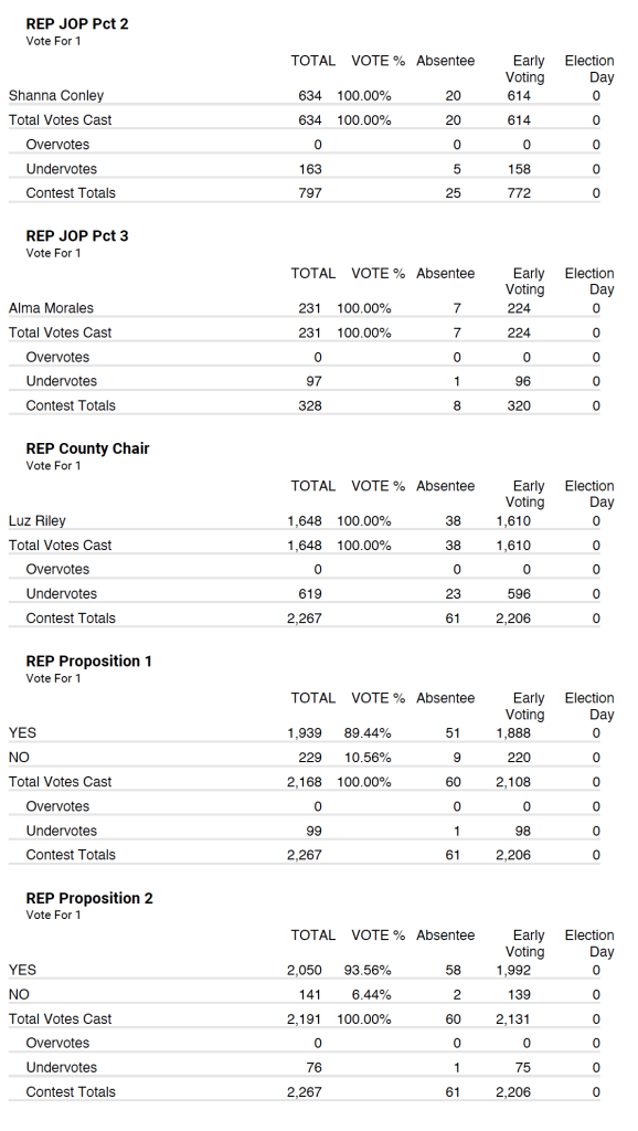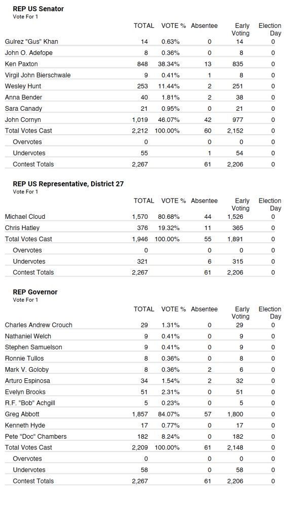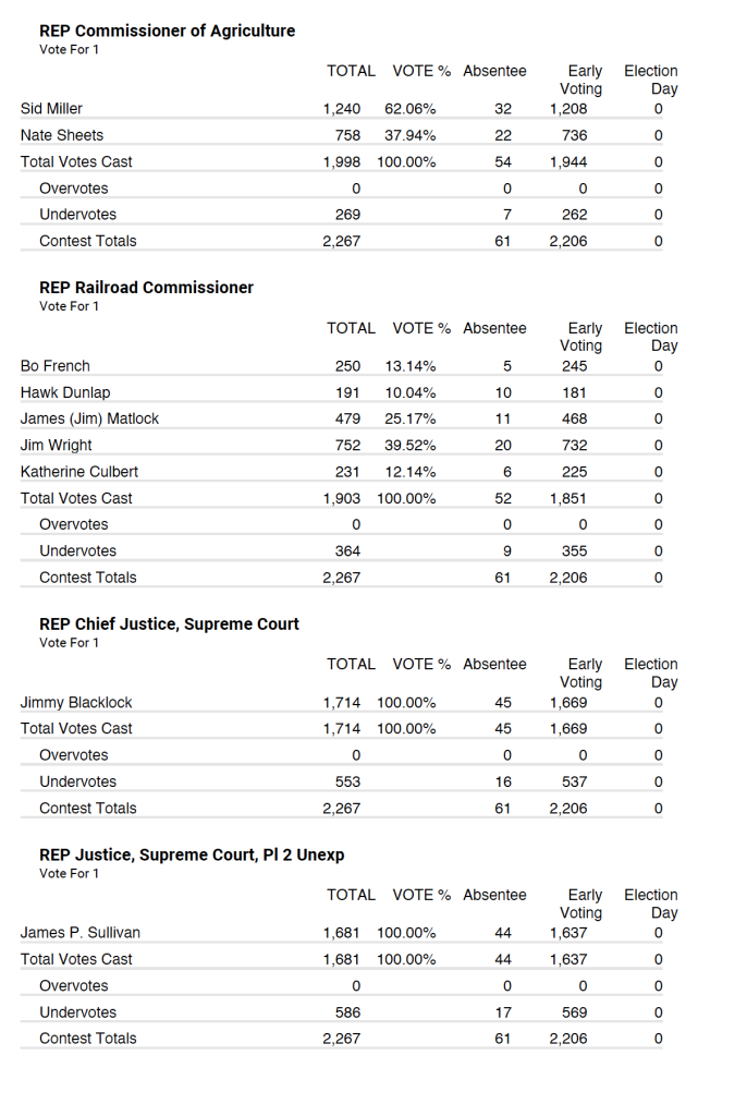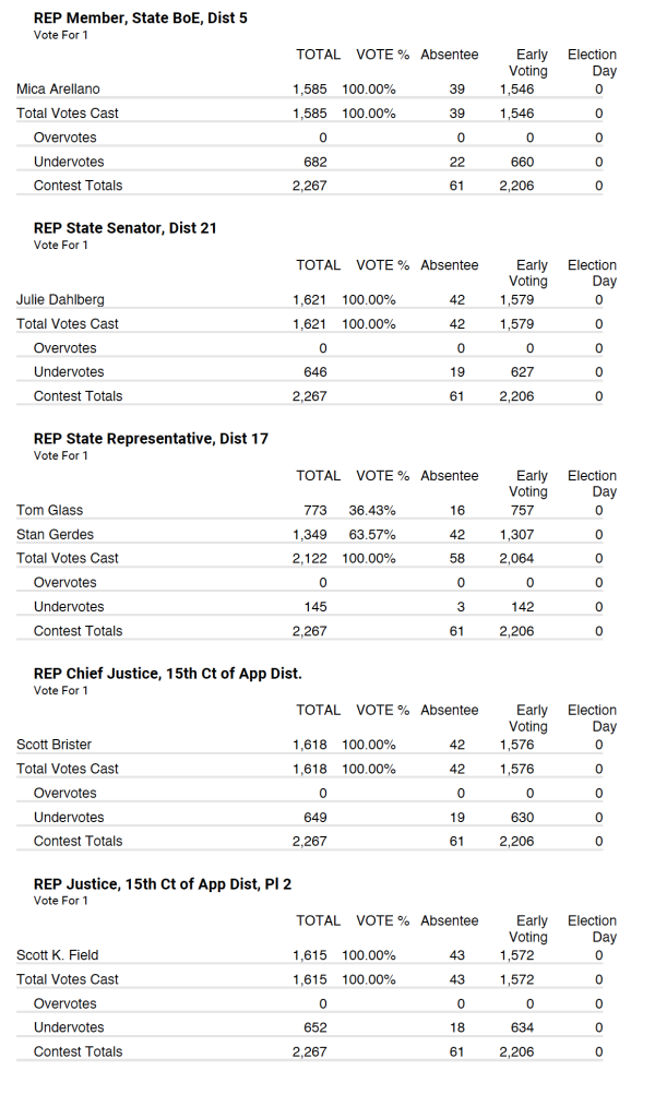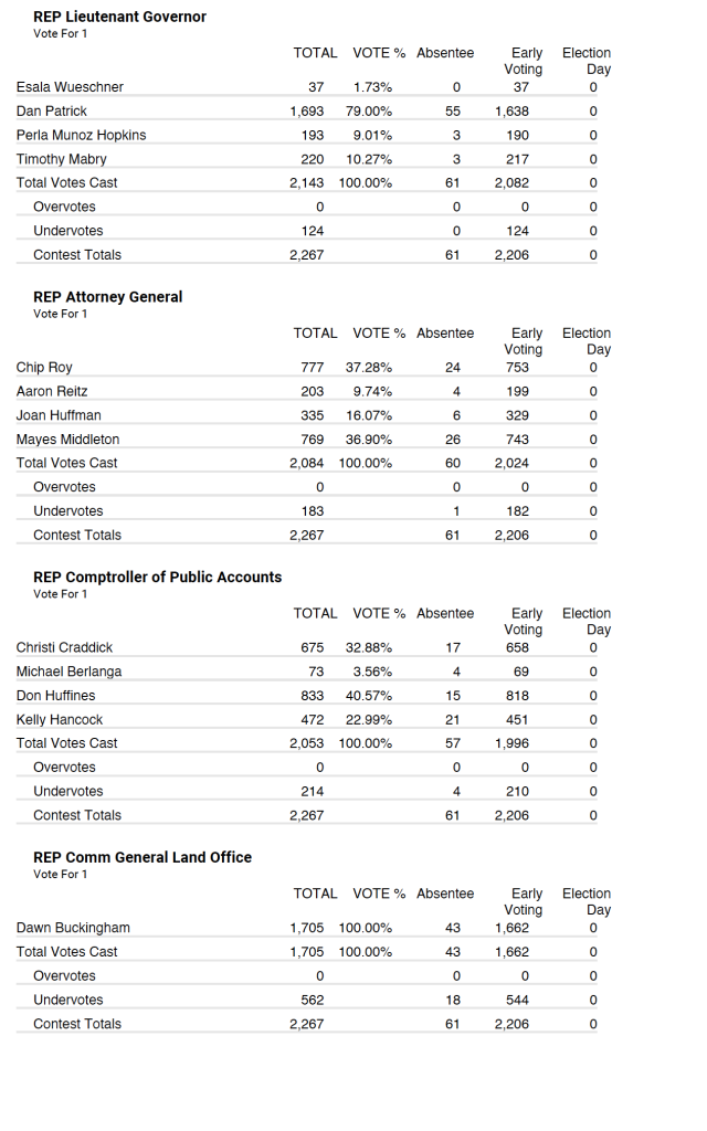 Republican party tallied 2,267 total votes with 61 being absentee and 2,206 being early voting.