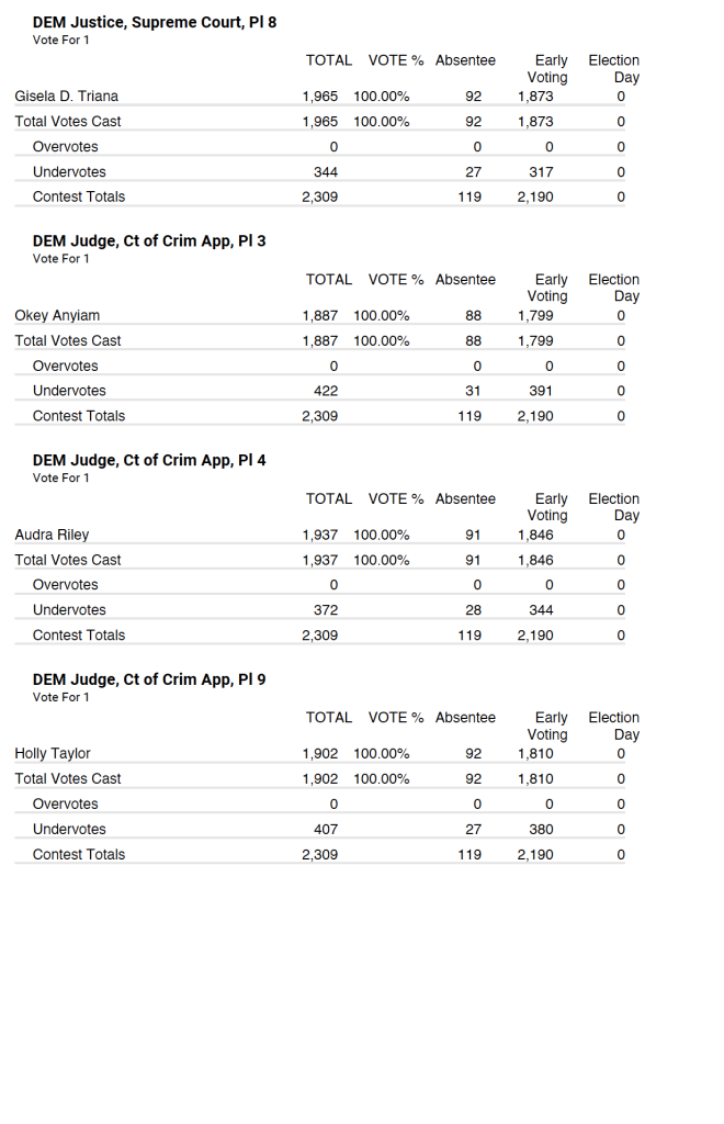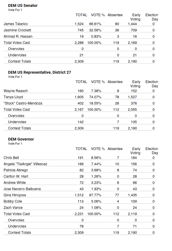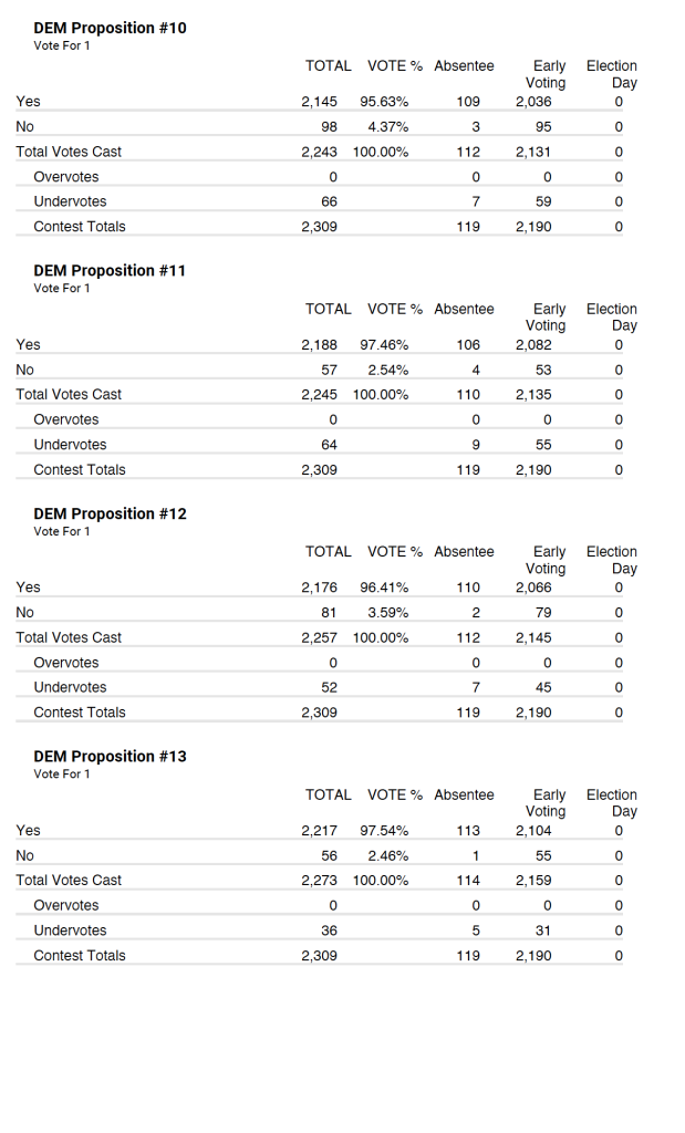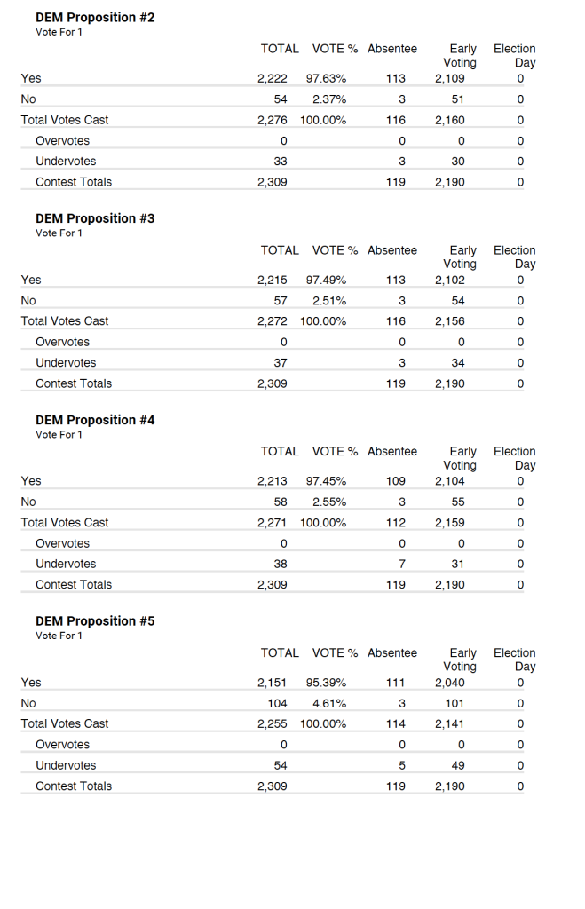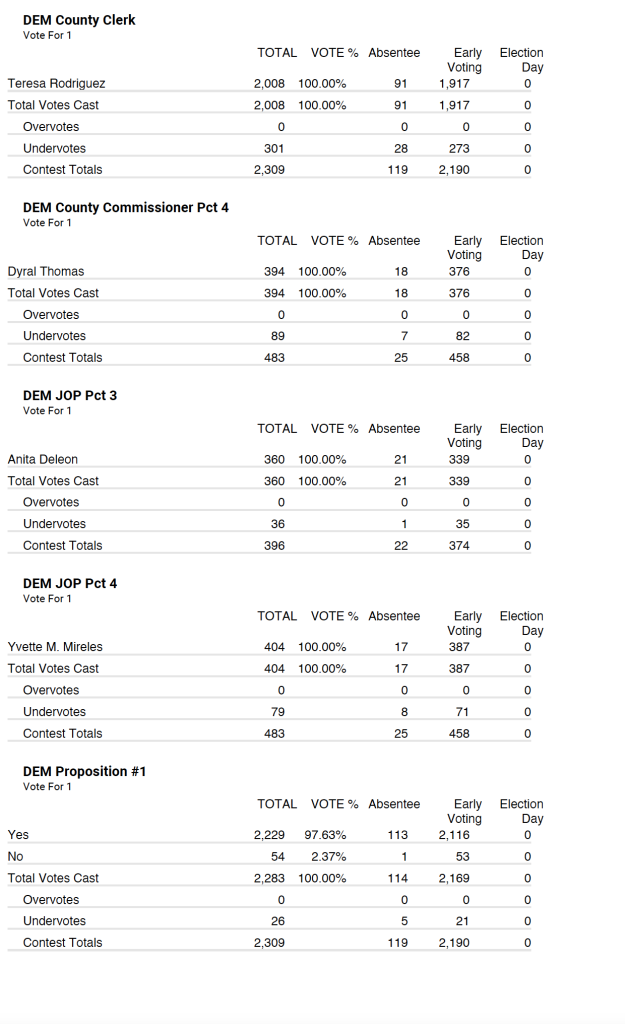 Democrat party tallied very similar with 2,309 total votes with 119 being absentee and 2,190 being early voting.