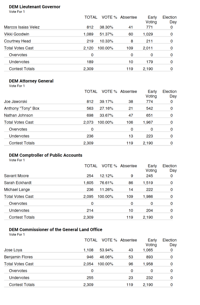 Democrat early/absentee early voting results. Watch for final results as they are announced.