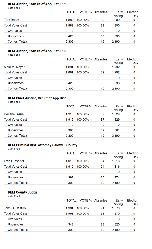 Caldwell County early voting and absentee totals have been announced. Election records show there are 27,212 registered voters in the county. Turnout for early came in as follows: