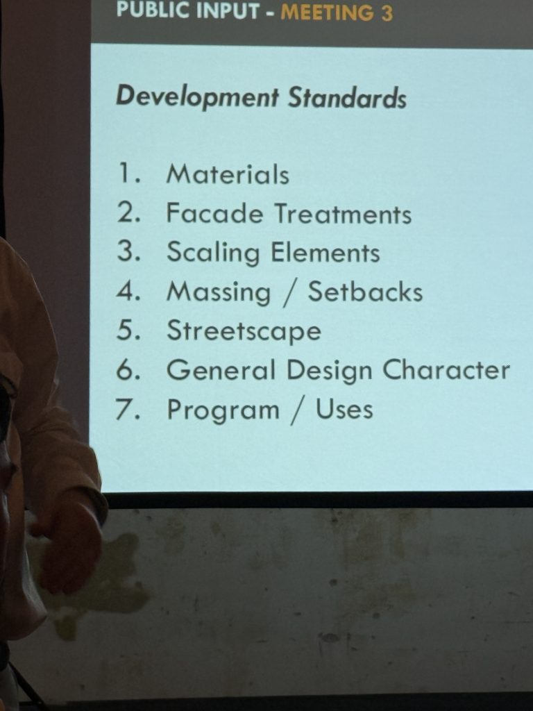 Meeting #3 will be two weeks later on Wednesday, December 17 to include discussion on covering design standards, materials, scale, streetscape, and preservation priorities.