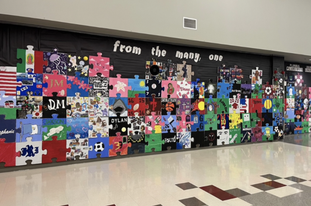 The Latin phrase, E Pluribus Unum, meaning “From the Many, One,” serves as the inspiration and title for the piece. Originally adopted as the national motto of the United States, the phrase symbolizes the enduring strength that emerges when diverse individuals come together in a shared purpose. In this spirit, each student contributed a one-of-a-kind puzzle piece that, when assembled, forms a cohesive and striking visual narrative of inclusion and community.