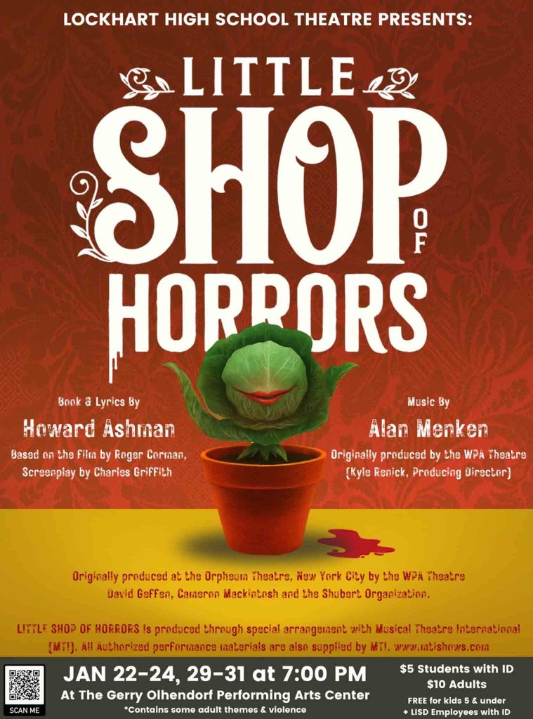Lockhart High School Theatre invites the community to experience the delightfully spooky and wildly entertaining Little Shop of Horrors. Join students for an unforgettable night of music, laughter, and a plant with a BIG personality.