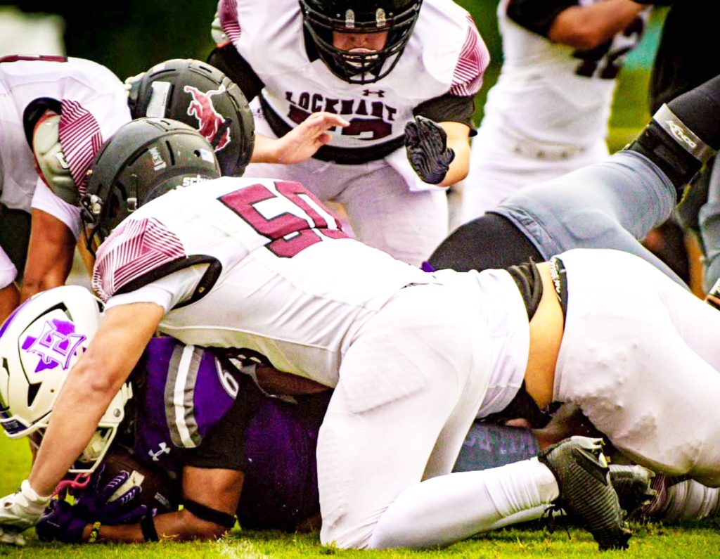 Above, Lockhart Lion football player, #50 David Seavers, tackles his opponent. Photo by Warren Yanez.