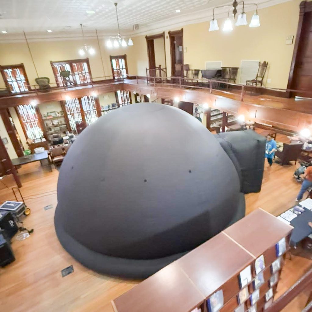 The mobile planetarium consists of inflatable domes measuring up to 18 feet wide and 14 feet high, large enough to seat up to 45 children or 30 adults. The dome, which was set up inside the library, offered high-definition projections of the night sky, complete with simulated stars, planets, and deep-space visuals.