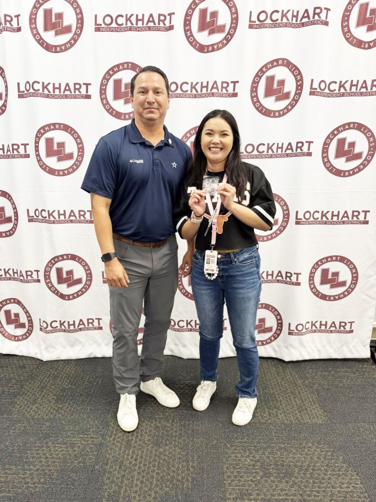 At the recent district staff meeting, Superintendent Estrada proudly presented LISD’s Communications Specialist, Ms. Dechanel Santos, with a Spirit of 1.5 pin.